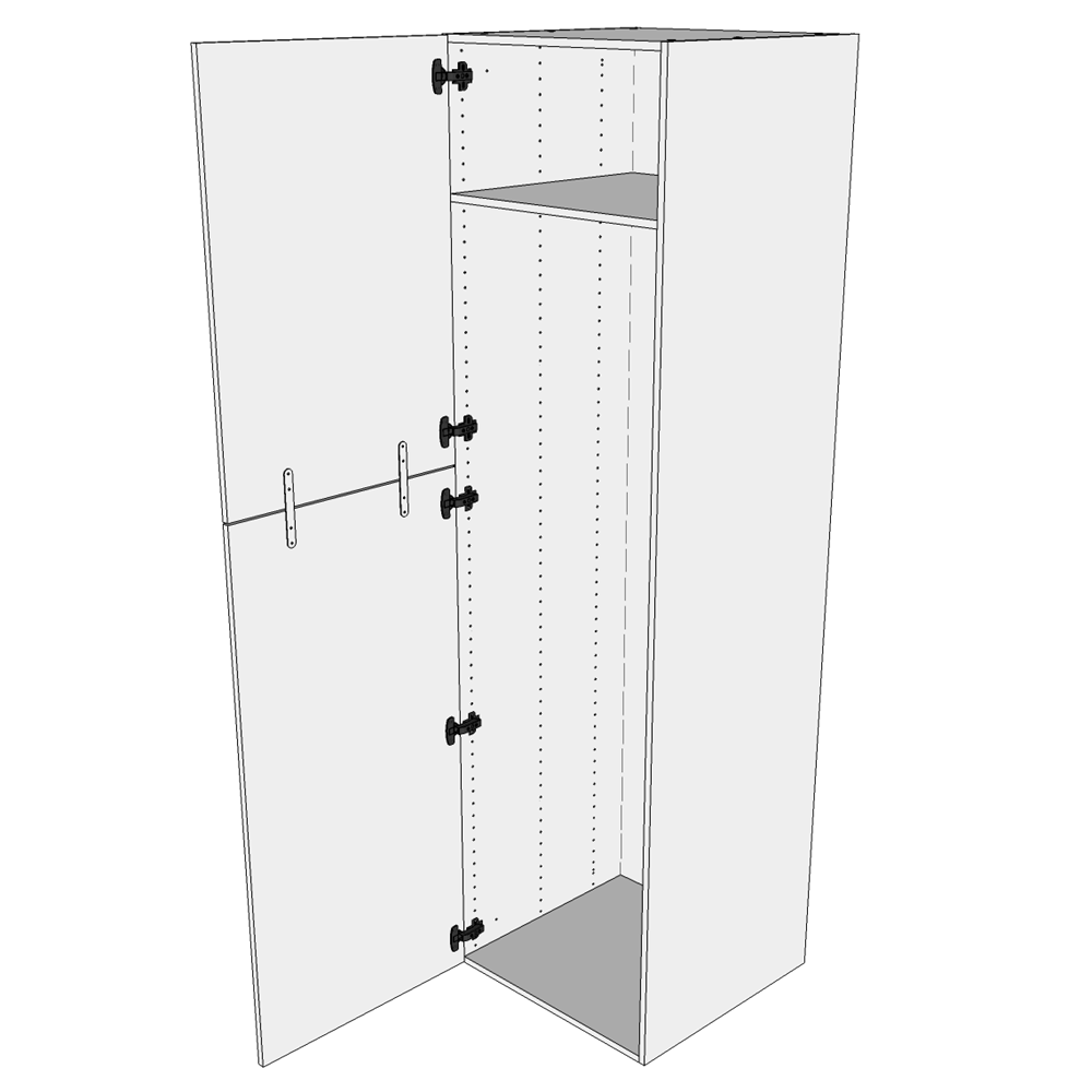 Højt tomt skab – Ekstra højtEt ekstra højt tomt skab med låger perfekt til opbevaring.Korpus i 16mm hvidt melamin udvendigt og indvendigt samt skjulte samlinger og minifix beslag.Der er altid 10 års garanti på vores dansk produceret skabe.Låge 1 H: 895 m (Læs mere)